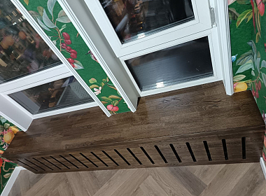 Подоконники из натурального дерева в квартиру. Изготовлены из сращенного щита дуба толщиной 40мм, покрыты маслом с твердым воском, цвет тонировки "Венге". Выбранный оттенок прекрасно сочетается с оформлением оконных рам в помещении. Форма изделий прямоугольная с небольшими ушками с двух сторон, на торцах сделана фаска 6мм.