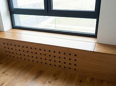 Специалистами РСК-интерьер изготовлена серия подоконников из дуба. Работа включала доставку и установление в барбершопе. Конструкция имеют сложную зигзагообразную форму, занимает плоскость в зоне оконного проема и проходит по угловым стенам. В целом, проект состоит из 8 дубовых подоконников, составляющих единую стилистическую композицию. Оригинальное интерьерное изделие создаёт в помещении одновременно стильный антураж и функциональные полки.